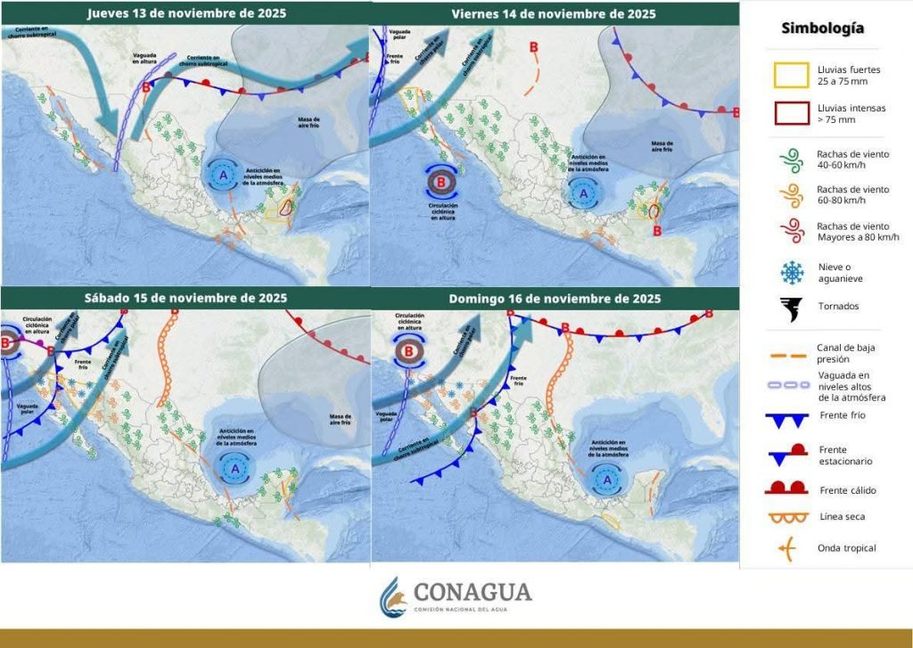 Durante el sábado, la aproximación e ingreso de un nuevo frente frío al noroeste de México, en interacción con una vaguada polar y una circulación ciclónica en altura, generarán vientos fuertes a muy fuertes con tolvaneras, marcado descenso de las temperaturas, además de probabilidad de chubascos y lluvias ligeras a moderadas acompañadas de descargas eléctricas en Sonora. Así mismo, durante la tarde del viernes y la madrugada del sábado, hay probabilidad para la caída de nieve o aguanieve en la zona montañosa.