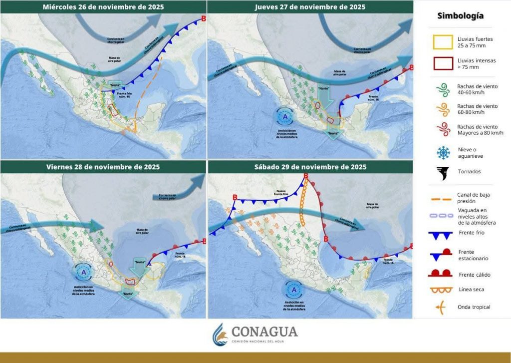 Por otro lado, un nuevo frente frío se aproximará a la frontera noroeste del país durante el día sábado 29 de noviembre, generando rachas de viento fuertes (+65 km/h) y un descenso en las temperaturas.