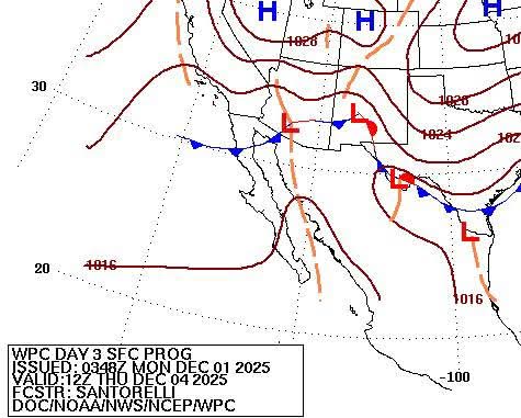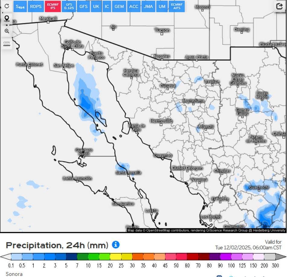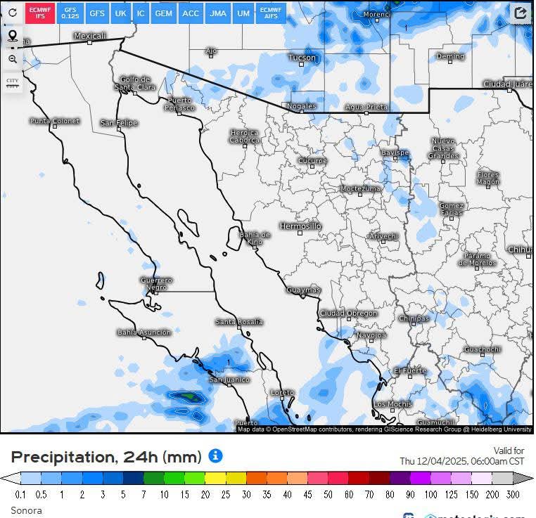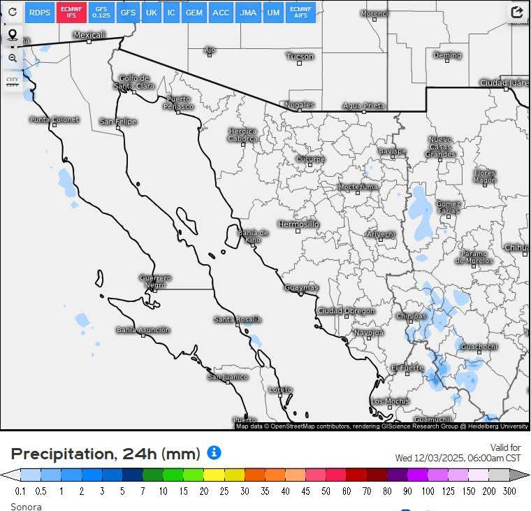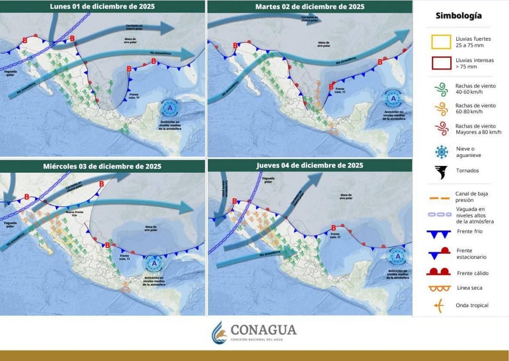 Por su parte, un nuevo frente frío se aproximará sobre la frontera norte de Sonora durante el día 04 de diciembre ocasionando un marcado descenso de temperaturas, lluvias de ligeras a moderadas, rachas de viento fuertes y la probabilidad de caída de nieve y aguanieve sobre la región montañosa.