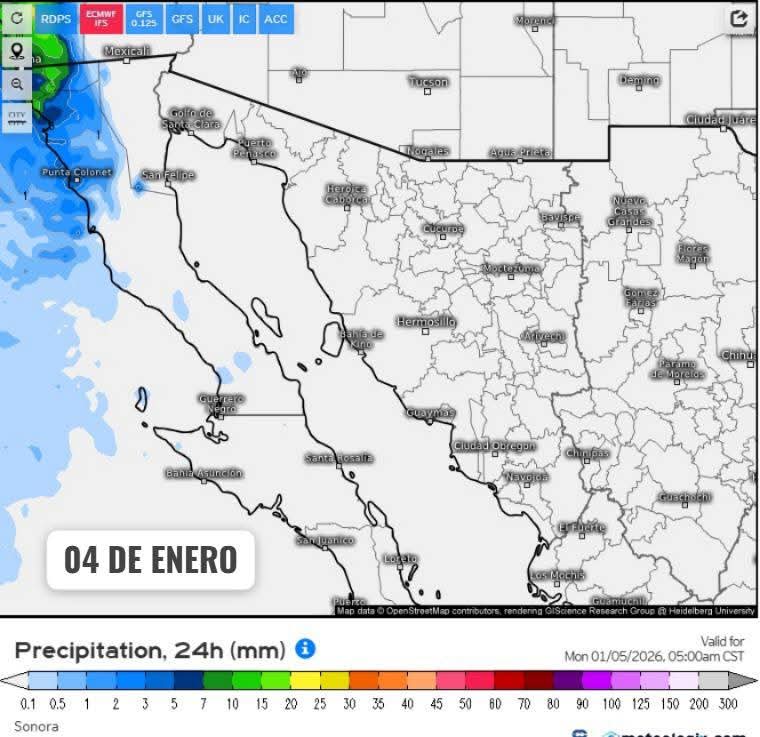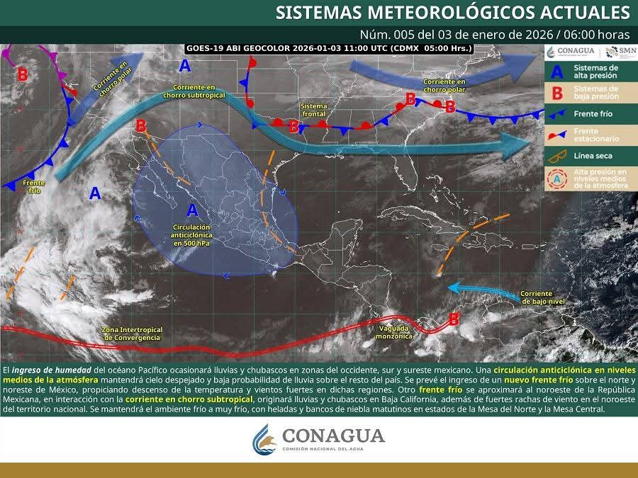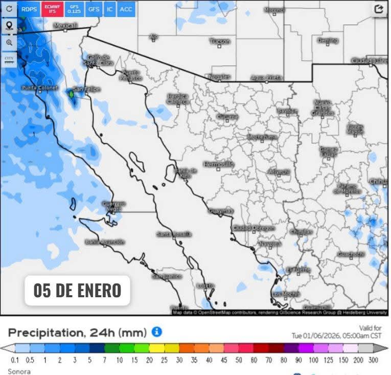 Finalmente, un nuevo frente frío se aproximará al noroeste del país durante los días 06 y 07 de enero generando lluvias de ligeras a moderadas sobre el noroeste y norte de Sonora, un descenso de temperaturas marcado y rachas de viento fuertes sobre dicho sector.