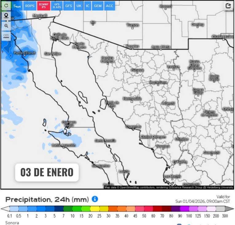 Hermosillo, Sonora a 03 de enero de 2026.- Sábado, basándose en la valoración y análisis de la información meteorológica en general y con base en información del Servicio Meteorológico Nacional y diferentes fuentes oficiales de los Estados Unidos, la Coordinación Estatal de Protección Civil emite el siguiente pronóstico: