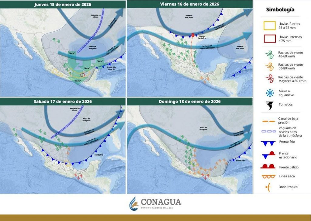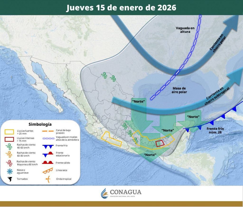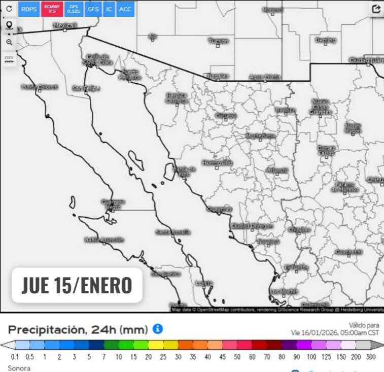 Hermosillo, Sonora a 15 de enero de 2026.- Jueves, basándose en la valoración y análisis de la información meteorológica en general y con base en información del Servicio Meteorológico Nacional y diferentes fuentes oficiales de los Estados Unidos, la Coordinación Estatal de Protección Civil emite el siguiente pronóstico: