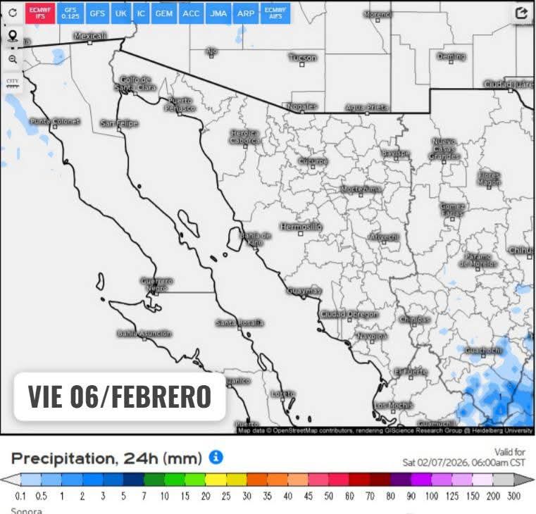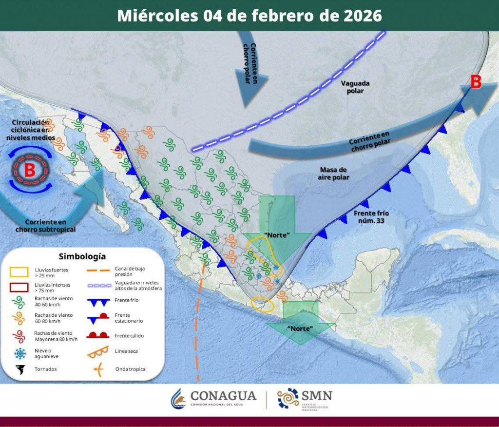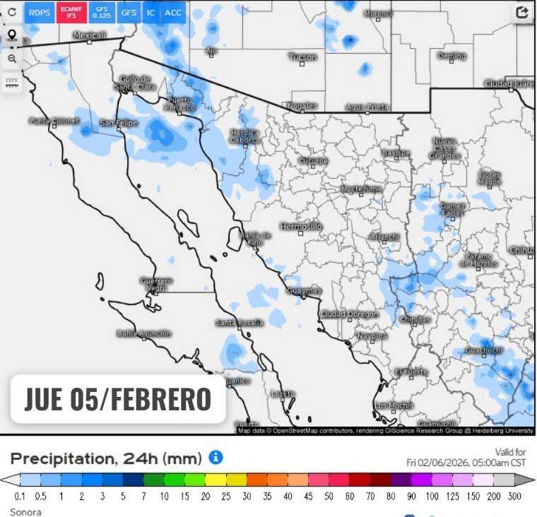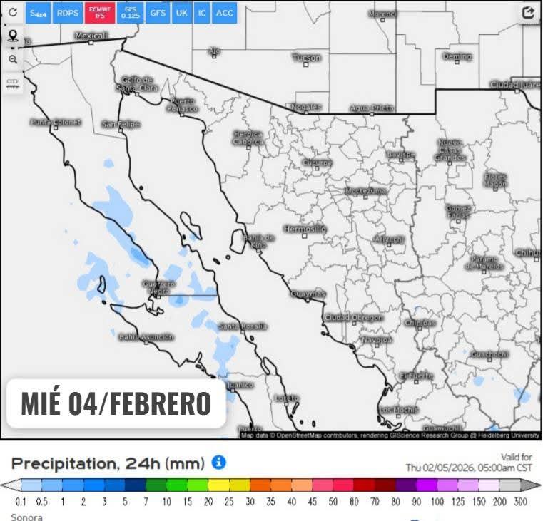 Hermosillo, Sonora a 04 de febrero de 2026.- Miércoles, basándose en la valoración y análisis de la información meteorológica en general y con base en información del Servicio Meteorológico Nacional y diferentes fuentes oficiales de los Estados Unidos, la Coordinación Estatal de Protección Civil emite el siguiente pronóstico: