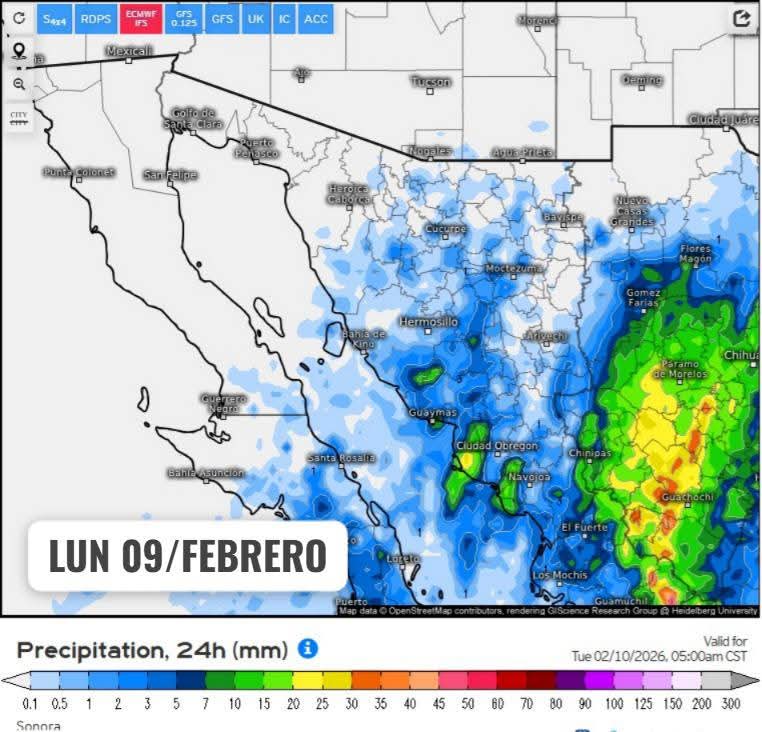 Por su parte, un nuevo sistema invernal ingresará al estado de Sonora durante los días 12 y 14 de febrero, propiciando lluvias, descenso de temperatura y rachas de viento sobre el norte de Sonora.