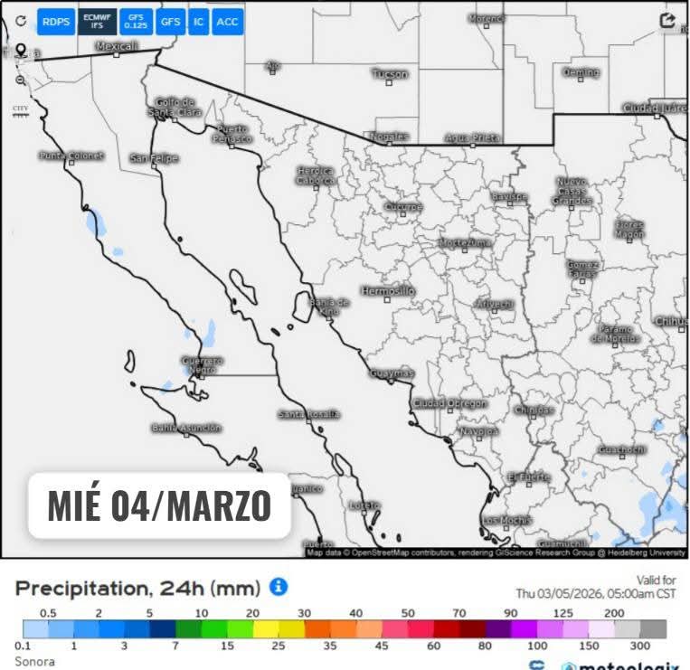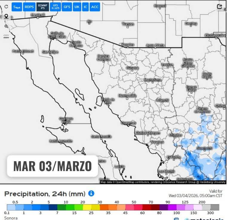 Hermosillo, Sonora a 03 de marzo de 2026.- Martes, basándose en la valoración y análisis de la información meteorológica en general y con base en información del Servicio Meteorológico Nacional y diferentes fuentes oficiales de los Estados Unidos, la Coordinación Estatal de Protección Civil emite el siguiente pronóstico: