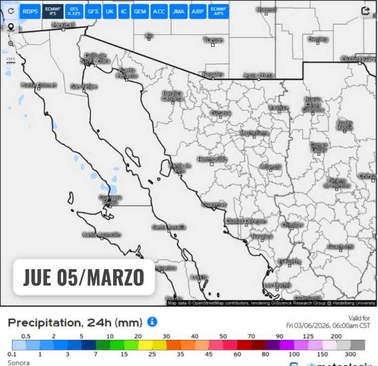 Por su parte, se pronóstica que un nuevo sistema invernal ingrese al estado de Sonora entre los días viernes 06 y sábado 07 de marzo impulsando inestabilidad suficiente para la generación de tormentas aisladas durante el fin de semana en gran parte del territorio. A su vez, estás condiciones se mantendrán los próximos 3 días posteriores al ingreso con efectos como un descenso marcado en las temperaturas, rachas de viento y posible caída de granizo.