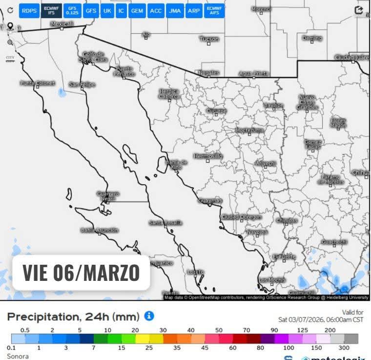Por su parte, se pronóstica que un nuevo sistema invernal ingrese al estado de Sonora entre los días viernes 06 y sábado 07 de marzo impulsando inestabilidad suficiente para la generación de tormentas aisladas durante el fin de semana en gran parte del territorio. A su vez, estás condiciones se mantendrán los próximos 3 días posteriores al ingreso con efectos como un descenso marcado en las temperaturas, rachas de viento y posible caída de granizo.