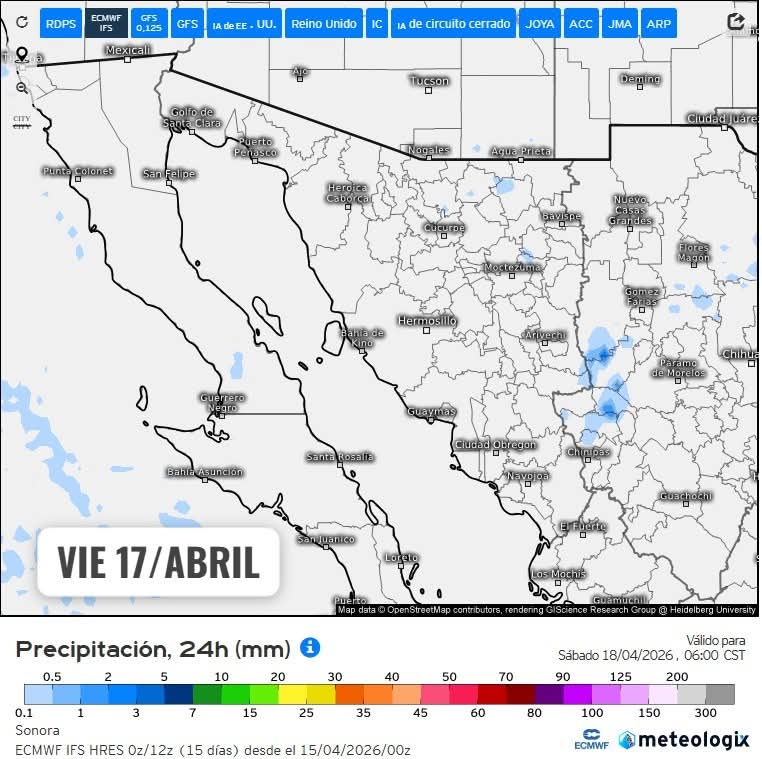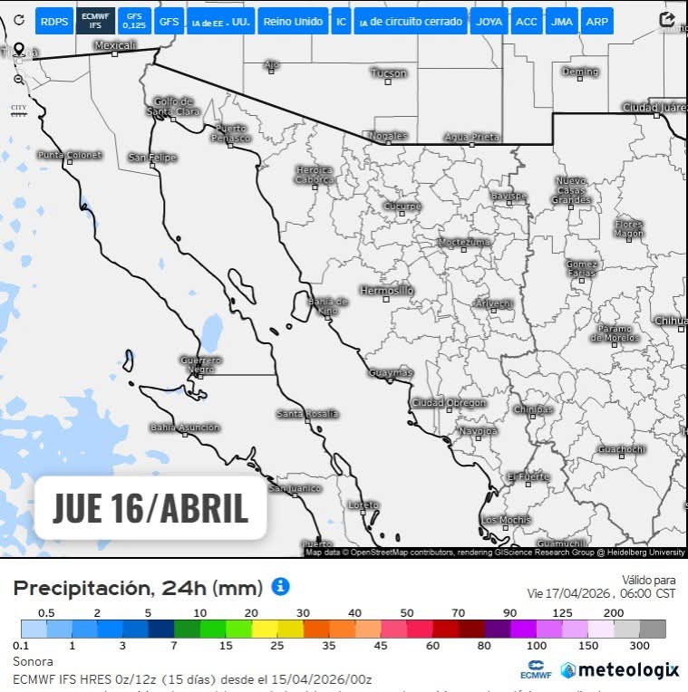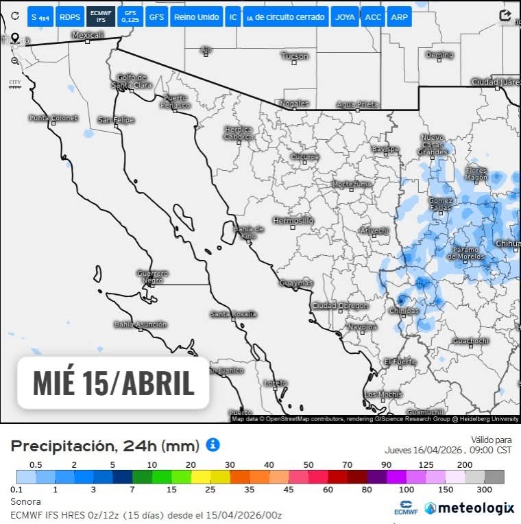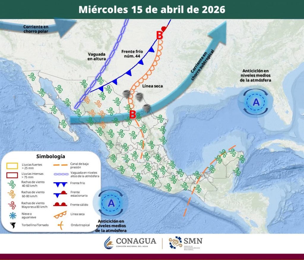 Se prevé el acercamiento de un nuevos sistema frontal hacia el norte de México durante los días 22 y 23 de abril. Dicho sistema podría generar rachas de viento fuertes, lluvias ocasionales y un ligero descenso en las temperaturas máximas a su paso.