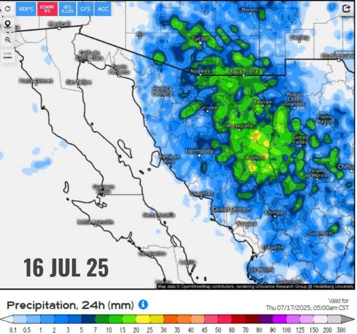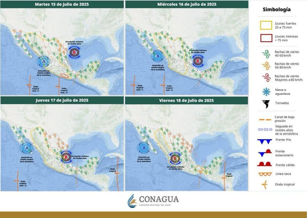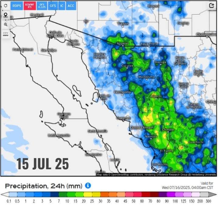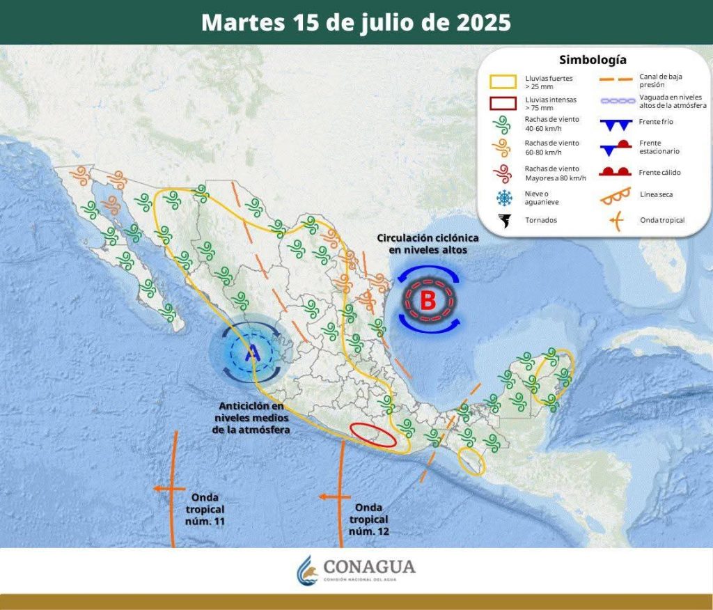 Hermosillo, Sonora a 15 de julio de 2025.- Martes, basándose en la valoración y análisis de la información meteorológica en general y con base en información del Servicio Meteorológico Nacional y diferentes fuentes oficiales de los Estados Unidos, la Coordinación Estatal de Protección Civil emite el siguiente pronóstico:
