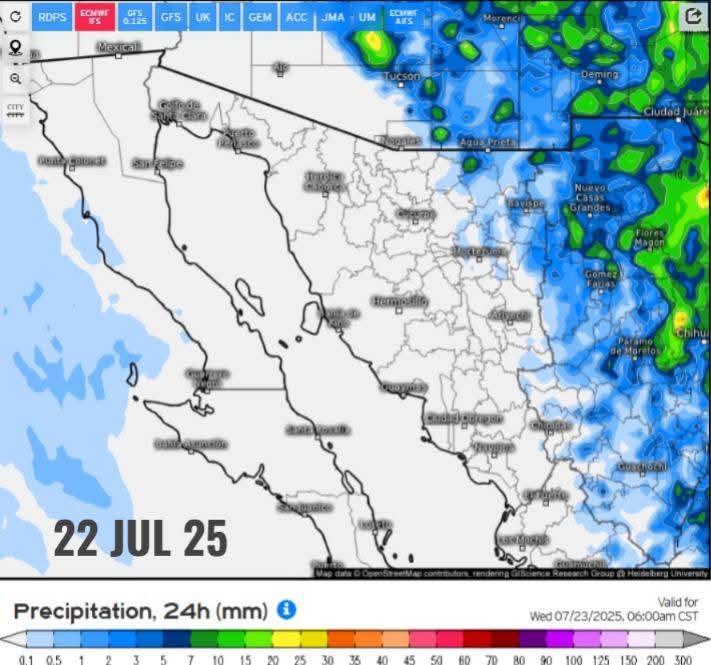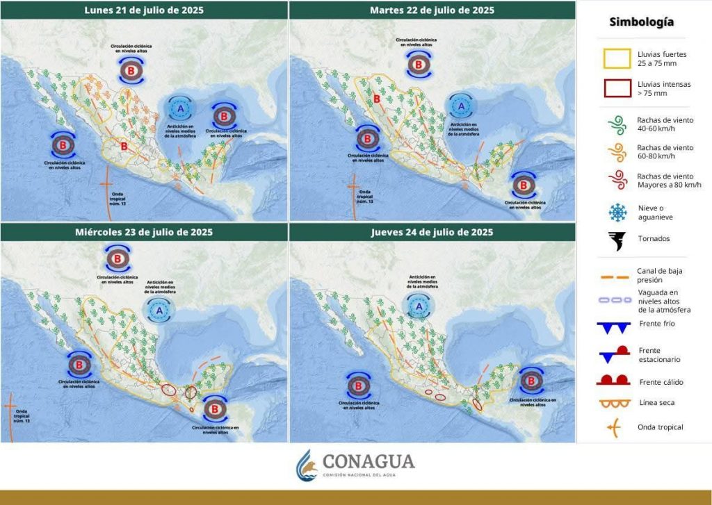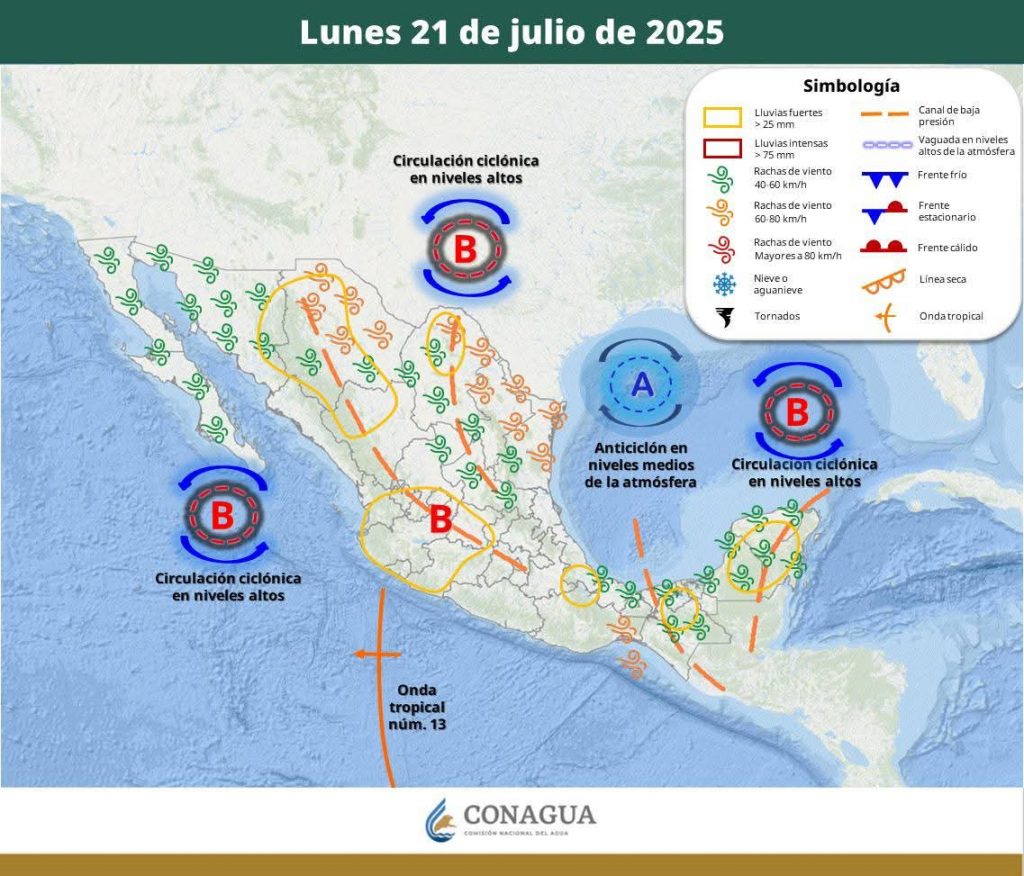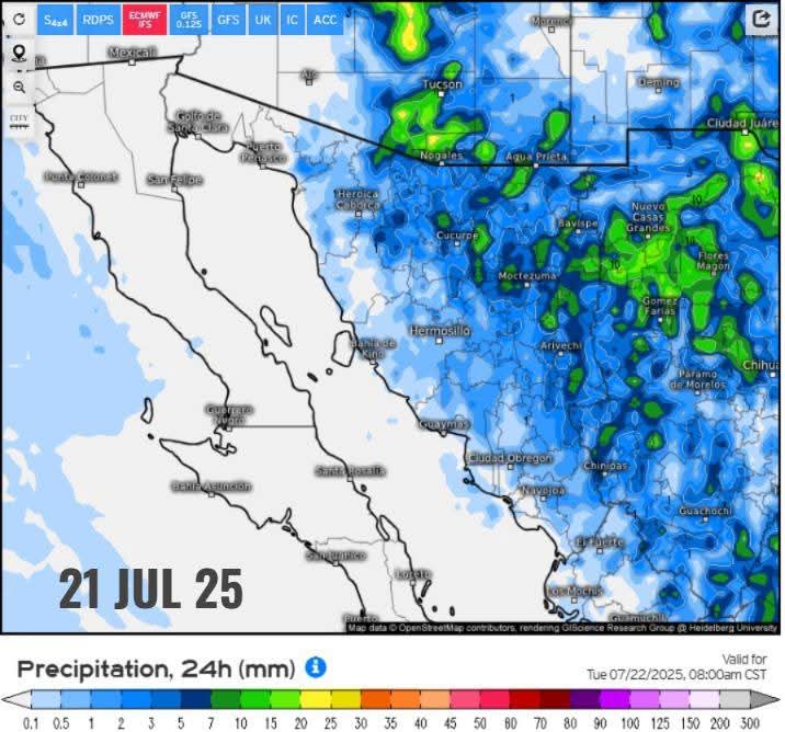 Hermosillo, Sonora a 21 de julio de 2025.- Lunes, basándose en la valoración y análisis de la información meteorológica en general y con base en información del Servicio Meteorológico Nacional y diferentes fuentes oficiales de los Estados Unidos, la Coordinación Estatal de Protección Civil emite el siguiente pronóstico: