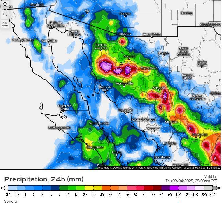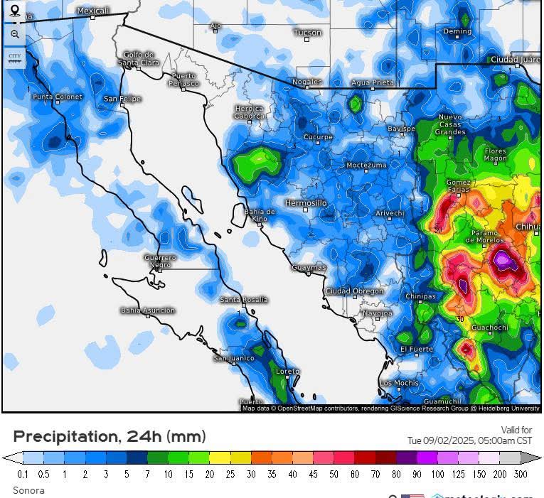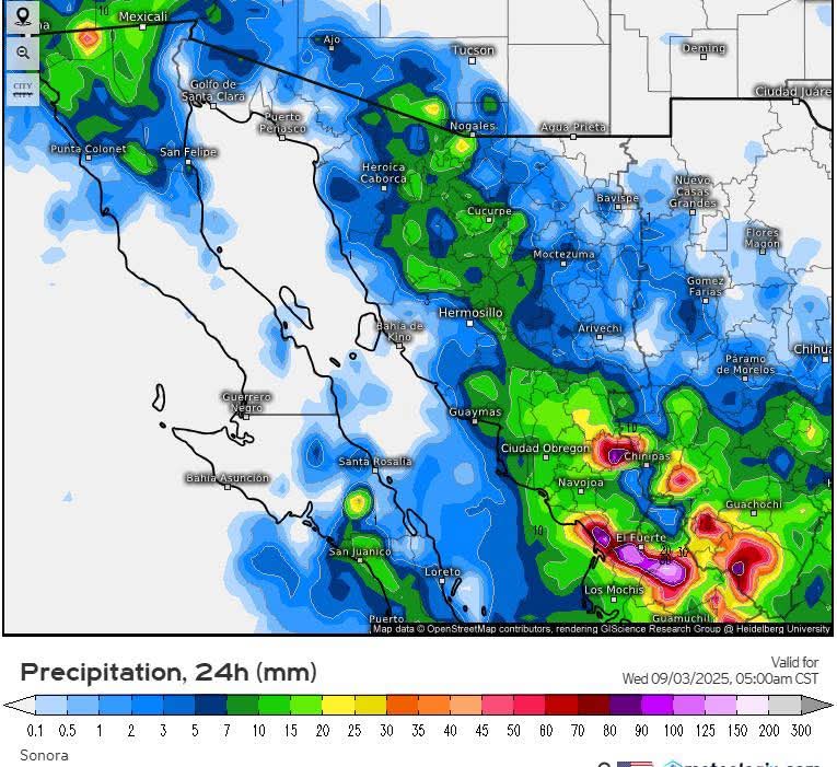 Por su parte, durante el día miércoles se prevé un desarrollo ciclónico en el Océano Pacifico el cuál se prevé se aproxime a las costas de Baja California Sur y en consecuencia, genere un gran aporte de humedad ocasionando lluvias de intensas a extraordinarias especialmente en el sur de Sonora.