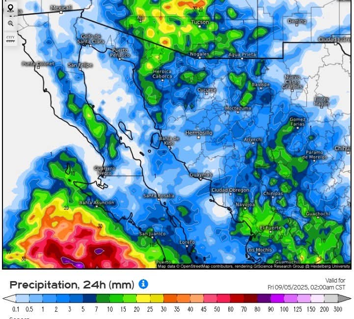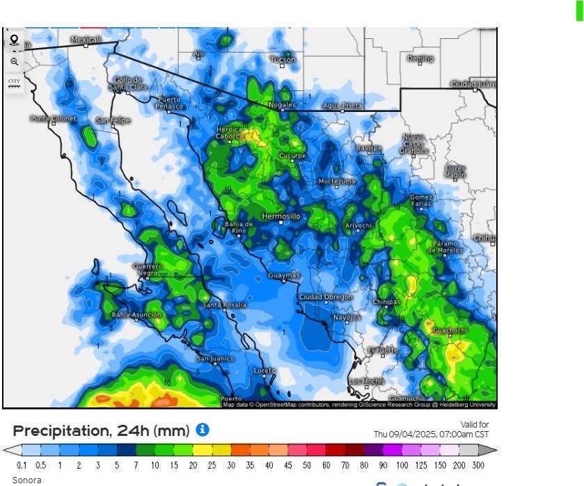 Los efectos del monzón mexicano en interacción con divergencia ocasionarán tormentas eléctricas con lluvias de fuertes a muy fuertes (25 a 75mm) y fuertes rachas de viento (+65 km/h) sobre el oriente, sur, norte, nororiente, y centro en horario vespertino. Asimismo, se prevé un ambiente de caluroso a muy caluroso con temperaturas máximas entre 40 a 45°C sobre el noroeste de la entidad Sonorense.