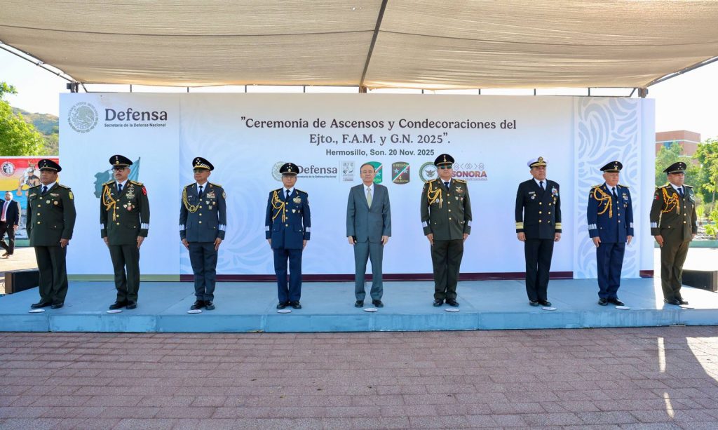 Hermosillo, Sonora; 20 de noviembre de 2025.- Un reconocimiento al profesionalismo, compromiso y entrega que demuestran las Fuerzas Armadas en su labor diaria, realizó el Gobernador Alfonso Durazo Montaño al encabezar el evento de la Ceremonia de Ascensos y Condecoraciones 2025 del Ejército, Fuerza Aérea Mexicana y Guardia Nacional, en la que 31 oficiales fueron promovidos a su grado inmediato superior.