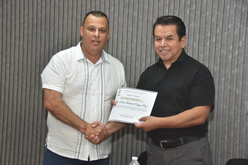 En el Salón Presidentes de Palacio, Ortega Ruiz estuvo acompañado por la síndico Martha Elena Armenta, y el director de Educación y Cultura, Obed Tellechea Rodríguez, en representación de Elías Retes.