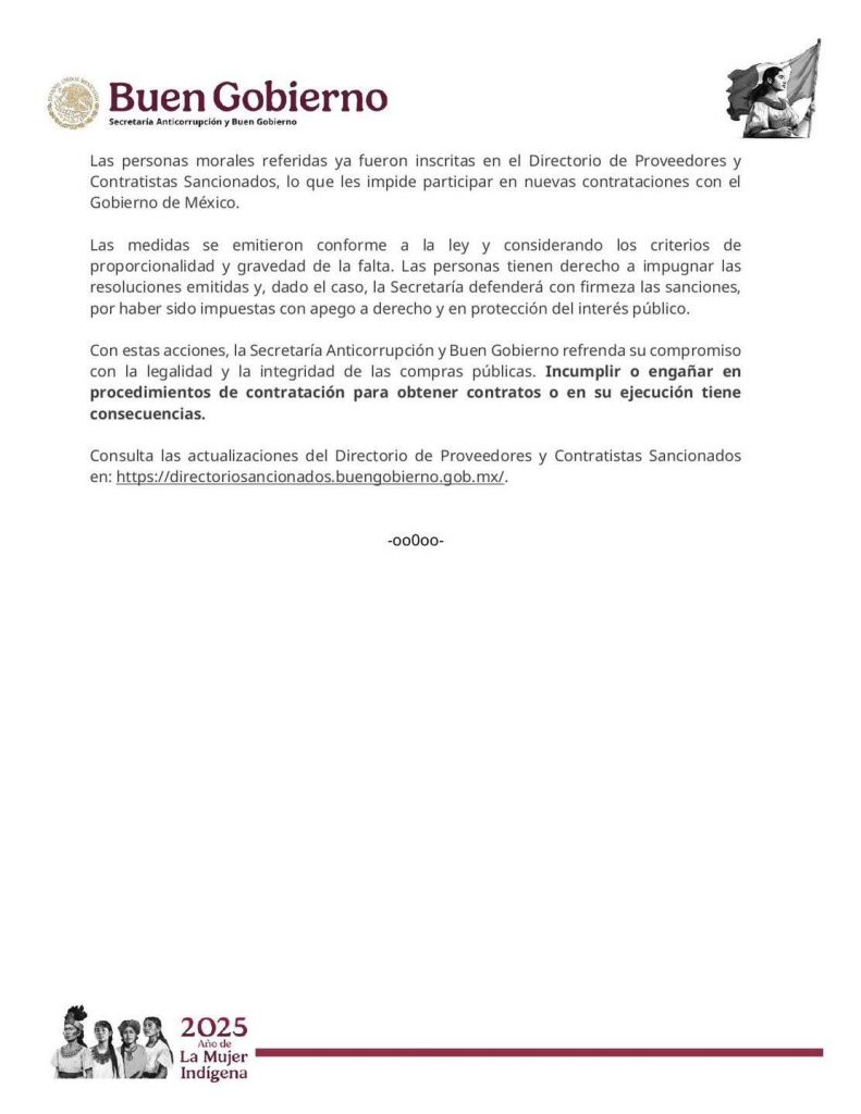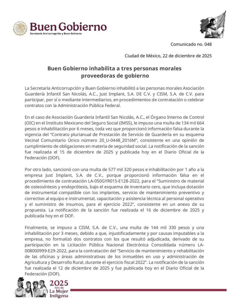 La Secretaría Anticorrupción y #BuenGobierno inhabilitó a las personas morales Asociación Guardería Infantil San Nicolás, A.C., Just Implant, S.A. DE C.V. y CISM, S.A. de C.V. para participar en procedimientos de contratación o celebrar contratos con Gobierno de México.