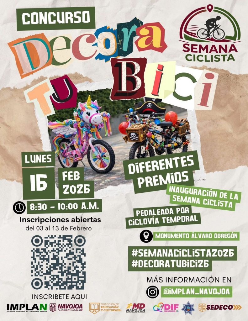 Navojoa, Sonora, 3 de febrero 2026.- En promoción al uso de la bicicleta como medio de transporte ecológico, económico, saludable y propiciador de convivencia, se desarrollará en Navojoa la “Semana Ciclista 2026”, del 16 al 20 de febrero próximo, y que incluye desde concurso de decoración de unidades, una pedaleada urbana, hasta una novedosa función de bici cinema.