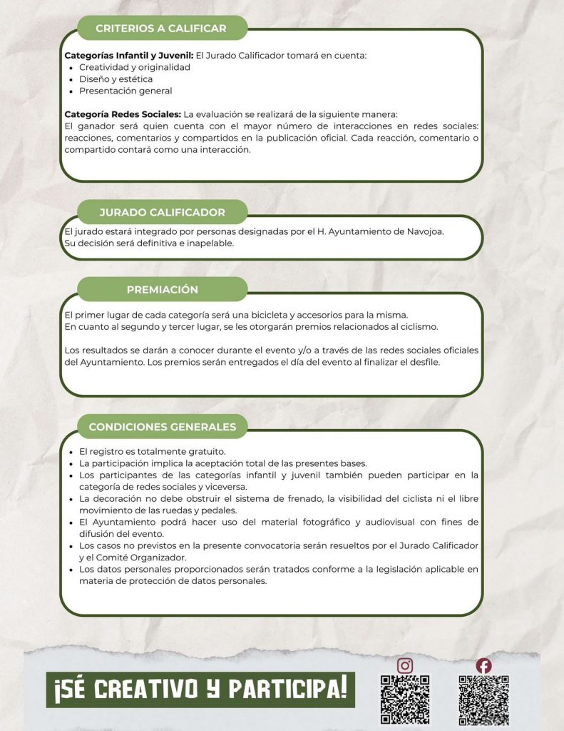 Tras la inauguración, el día lunes 16 en el monumento Obregón, habrá concurso de decoración de bicicletas en las categorías infantil, juvenil y adultos, quienes podrán inscribirse en forma directa y en redes sociales a través de un QR en la página oficial del IMPLAN, de este martes al viernes 13, y cuyos ganadores recibirán bicicletas, detalló.