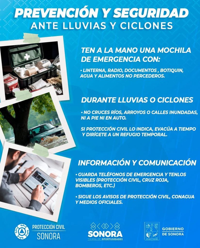 El Gobierno del Estado de Sonora y la Coordinación Estatal de Proteccion Civil, invitan a la comunidad para que en esta temporada de lluvias y ciclones tomen precauciones y siempre sigue las indicaciones de las autoridades correspondientes. 🌧️