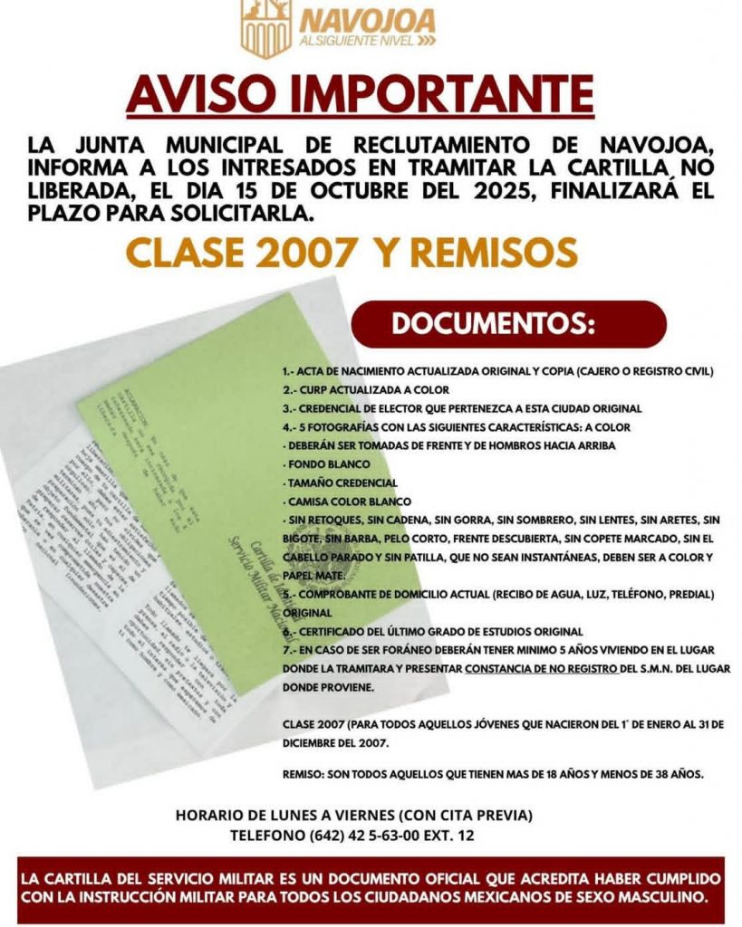 La Junta Municipal de Reclutamiento de Navojoa informa que el plazo para tramitar la cartilla del Servicio Militar Nacional (no liberada) finaliza el 15 de octubre de 2025.