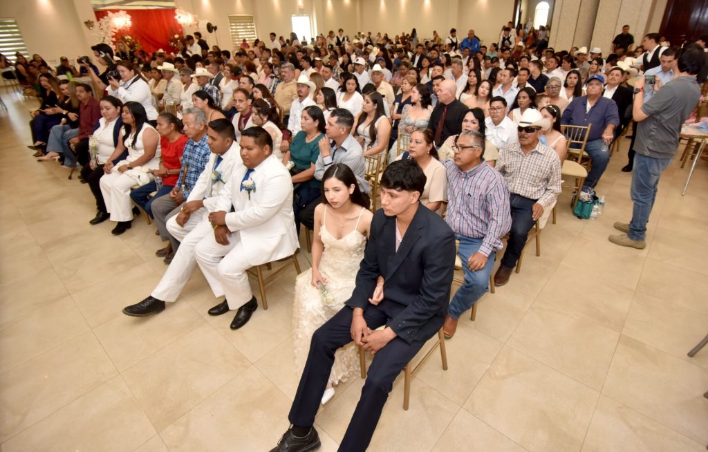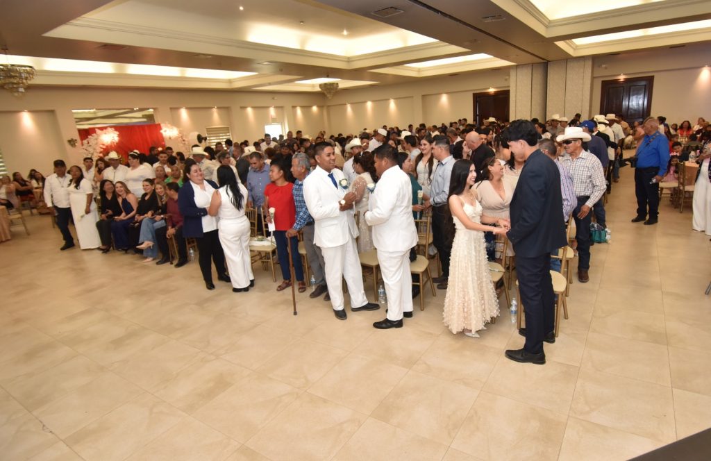 Navojoa, Sonora, 27 de marzo 2026.- Enmarcados en la inclusión, el sentimiento de alegría y amor, 150 parejas de navojoenses unieron legalmente sus vidas, este viernes, durante la celebración de los Matrimonios Colectivos 2026, teniendo como testigo de honor a la presidenta del DIF, Luz Argel Gaxiola de Elías, autoridades del Registro Civil del Estado, regidores, familiares y amigos de los contrayentes.