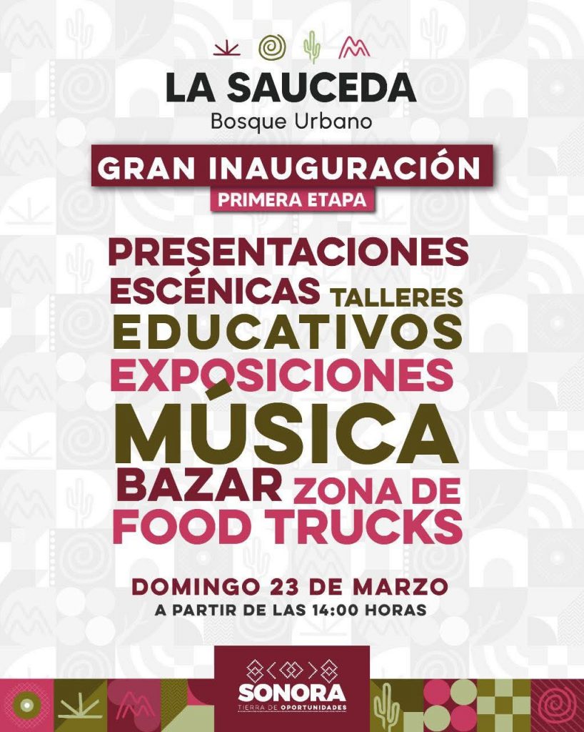 La Secretaría de Educación y Cultura, agradece al Ejecutivo estatal Alfonso Durazo, el haber rescatado el Bosque Urbano La Sauceda, que será un lugar de esparcimiento familiar, permitiendo disfrutar de la celebración de eventos artísticos y culturales.