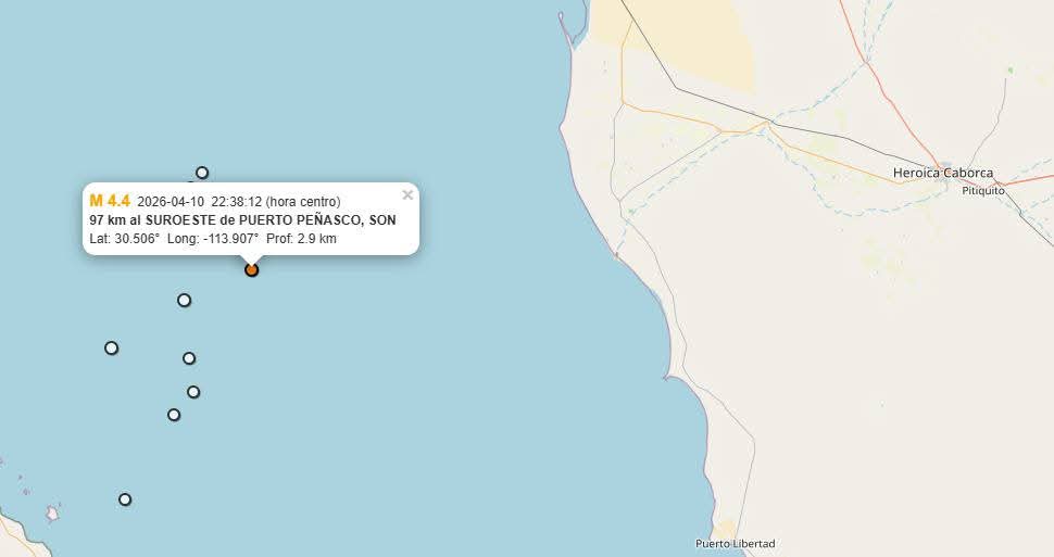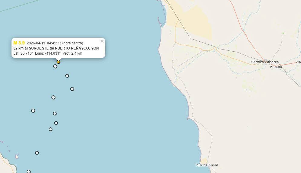 Luego de que el Servicio Sismológico Nacional reportara hoy dos movimientos telúricos de magnitud 3.9 y 4.4, al suroeste de Puerto Peñasco, se estableció que estos ocurrieron sin percepción del evento por la población, sin lesionados y sin daños reportados.